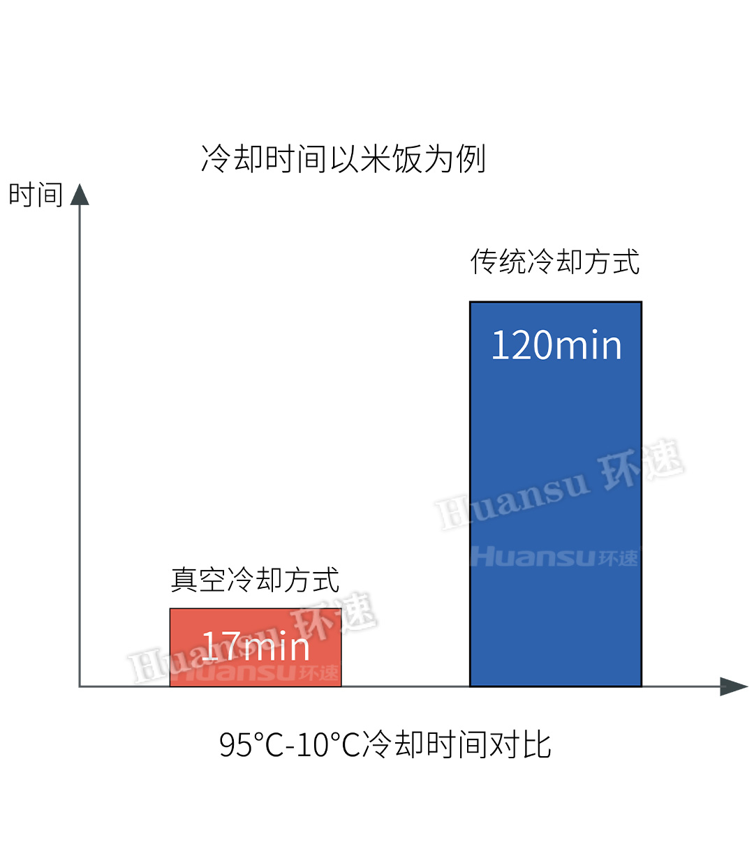 真空冷却机使用控菌冷却方式,将待冷却食品从高温降到常温仅需3-10分钟(因食材而定),降到10℃以下需9-28分钟,冷却后可按需求进行不同形式包装,生产效率大幅度提高,产量成倍增长,1-2年收回成本。高效率的冷却方式使冷却后的食品品相更佳,同时防止细菌滋生、保质期延长,更卫生!